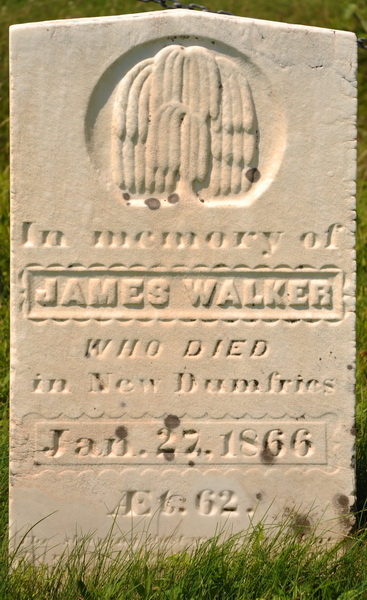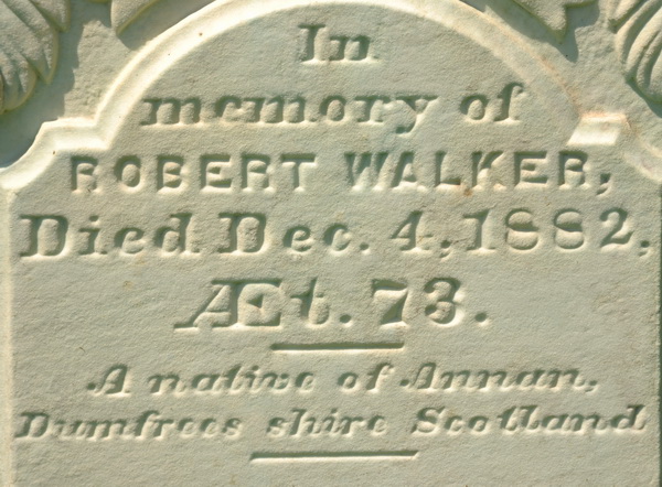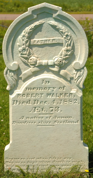 | Burial | He was buried in the Presbyterian Cemetery, North Bedeque, Prince County, Prince Edward Island, Canada, 46.36206, -63.72579G. Inscription: "FATHER / In / memory of / ROBERT WALKER / Died Dec. 4, 1882, / AEt. 73. / A native of Annan, / Dumfrees shire Scotland / May we so rest when life is o'er, / May we so hope when death is nigh, / And meet with loved ones gone before, / Where hearts ne'er ache nor loved ones die". Stonecutter signature: "Cairns & McLean".24 ![]() Tombstone, Robert Walker 1811-1882North Bedeque Cemetery, Prince County, Prince Edward Island, Canada. ![]() Inscription detail. |