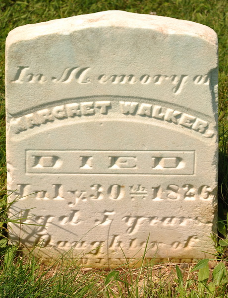 | Death | Margret Walker died on 30 July 1825, Her death entry in the John Walker Family Bible states that she was "Aged five years and three months". The date on her marker is "July 30th 1826", which does not match this age. Oral history says that she died during the voyage from Scotland to Prince Edward Island, but there are no records to confirm this.4 |