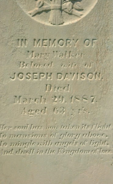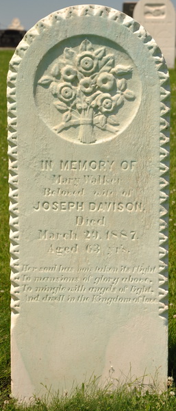 | Burial | She was buried in the Presbyterian Cemetery, North Bedeque, Prince County, Prince Edward Island, Canada, 46.36166, -63.72579G. Inscription: In Memory of / Mary Walker / Beloved wife of / Joseph Davison / Died / March 29, 1887 / Aged 63 yr's / Her soul has now taken its flight / To mansions of glory above, / To mingle with angels of light, / and dwell in the Kingdom of love. The burial location for her husband, Joseph Davison, is not known.8 ![]() Tombstone, Mary Walker (1824-1887)North Bedeque Cemetery, Prince County, Prince Edward Island, Canada. ![]() Inscription detail. |
