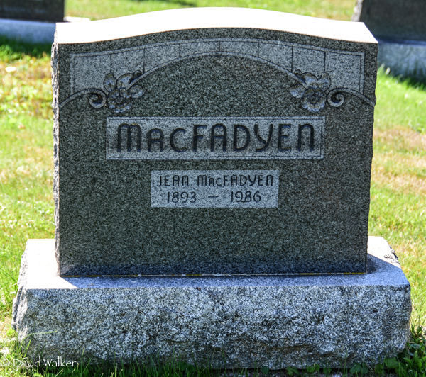 Inscription: MacFADYEN / Jean MacFadyen / 1893 - 1986.2  Tombstone, Jean MacFadyen (1893-1986). Church of Scotland Cemetery, Cape Traverse, Prince County, Prince Edward Island, Canada.