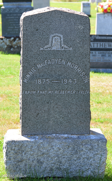 Inscription: Minnie MacFadyen Morrison / 1875 - 1943 / I Know That My Redeemer Liveth.2  Tombstone, Minnie Bertha MacFadyen (1875-1943). Church of Scotland Cemetery, Cape Traverse, Prince County, Prince Edward Island, Canada.