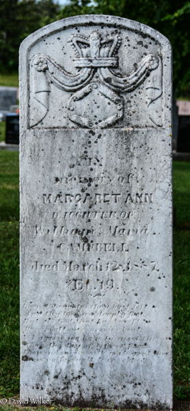 Inscription: In / memory of / Margaret Ann / Daughter of / William & Maria / Campbell / died March 12, 1887, / Æt. 19.1,2  Tombstone, Margaret Ann CAmpbell (c1868-1887). St. Stephen's Anglican Church Cemetery, Irishtown, Prince County, Prince Edward Island, Canada.
