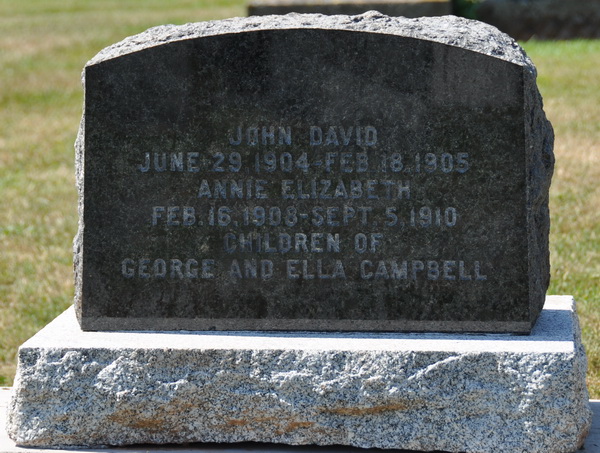 | Burial | He was buried in Geddie Memorial Cemetery, Springbrook, Queens County, Prince Edward Island, Canada, 46.49425, -63.50733G. stone #222. Inscription: John David / June 29, 1904 - Feb. 8, 1905 / Annie Elizabeth / Feb. 16, 1908 - Sept. 5, 1910. / children of / George and Ella Campbell.1 Tombstone, John David Campbell (1904-1905), his sister Annie Elizabeth Campbell (1908-1910). Geddie Memorial Cemetery, Springbrook, Queens County, Prince Edward Island, Canada. |