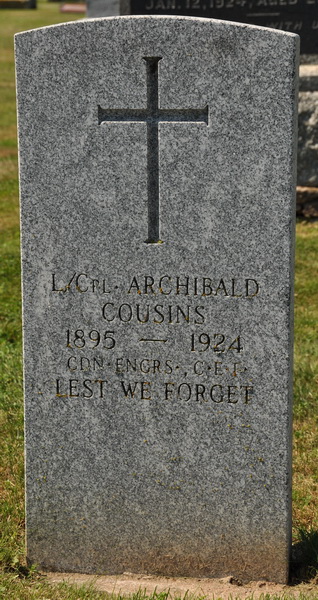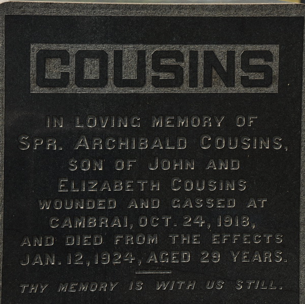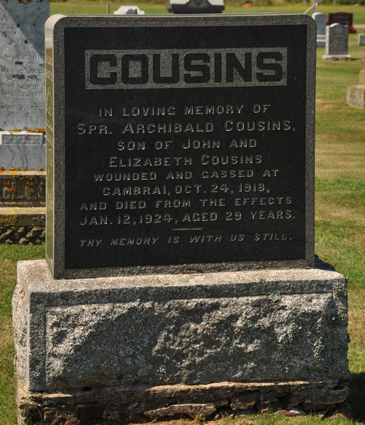 | Burial | He was buried in Geddie Memorial Cemetery, Springbrook, Queens County, Prince Edward Island, Canada, 46.49416, -63.50753G. stone #239.Inscription: COUSINS / In Loving Memory of / Spr. Archibald Cousins / son of John and / Elizabeth Cousins / wounded and gassed at Cambrai, Oct. 24, 1918, / and died from the effects / Jan. 12, 1924, aged 29 years. / Thy memory is with us still. Left: In loving / memory of / George Cousins, / Died / Aug. 24, 1944, / Aged 38 years. / - / At Rest / Marion Millicent / 1891 - 1973. Right: In loving / memory of / John S. Cousins / Died / Sept. 28, 1947, / Aged 81 years. / Also His Wife / Elizabeth A. Campbell / Died / June 16, 1948, / Aged 79 years. / - / At Rest. Footstones: Millie, George, Military marker, Father, Mother.1![]() Tombstone, Archibald Cousins (1896-1924), his brother George (1906-1944), his sister Marion Millicent (1891-1973), their parents John S. Cousins (1866-1947) and Elizabeth Anne Campbell (1869-1948). Geddie Memorial Cemetery, Springbrook, Queens County, Prince Edward Island, Canada. ![]() Front inscription detail. ![]() Left inscription detail. ![]() Right inscription detail. ![]() Footstone, Marion Millicent Cousins. ![]() Footstone, George Cousins. ![]() Military marker, Archibald Cousins. ![]() Footstone, John Sutherland Cousins. ![]() Footstone, Elizabeth Anne Campbell. |