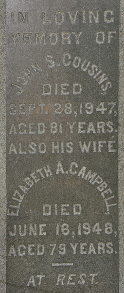 | Burial | She was buried in Geddie Memorial Cemetery, Springbrook, Queens County, Prince Edward Island, Canada, 46.49416, -63.50753G. stone #239.Inscription: COUSINS / In Loving Memory of / Spr. Archibald Cousins / son of John and / Elizabeth Cousins / wounded and gassed at Cambrai, Oct. 24, 1918, / and died from the effects / Jan. 12, 1924, aged 29 years. / Thy memory is with us still. Left: In loving / memory of / George Cousins, / Died / Aug. 24, 1944, / Aged 38 years. / - / At Rest / Marion Millicent / 1891 - 1973. Right: In loving / memory of / John S. Cousins / Died / Sept. 28, 1947, / Aged 81 years. / Also His Wife / Elizabeth A. Campbell / Died / June 16, 1948, / Aged 79 years. / - / At Rest. Footstones: Millie, George, Military marker, Father, Mother.4![]() Tombstone, Archibald Cousins (1896-1924), his brother George (1906-1944), his sister Marion Millicent (1891-1973), their parents John S. Cousins (1866-1947) and Elizabeth Anne Campbell (1869-1948). Geddie Memorial Cemetery, Springbrook, Queens County, Prince Edward Island, Canada. ![]() Front inscription detail. ![]() Left inscription detail. ![]() Right inscription detail. ![]() Footstone, Marion Millicent Cousins. ![]() Footstone, George Cousins. ![]() Military marker, Archibald Cousins. ![]() Footstone, John Sutherland Cousins. ![]() Footstone, Elizabeth Anne Campbell. |