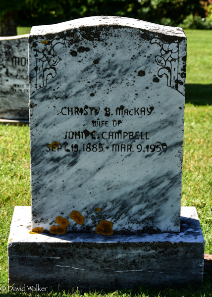 | Burial | She was buried in Geddie Memorial Cemetery, Springbrook, Queens County, Prince Edward Island, Canada, 46.49420, -63.50783G. stone #396. Inscription: William Campbell / Born 1836 / Died 1909 / CAMPBELL. Left: His son / Lorne / Born 1881 / Died 1911. / Robert Campbell / 1879 - 1946. Right: His daughter Jane W. / Born 1874 / Died 1904.1![]() Tombstone, William Campbell (1836-1909), his sons Lorne (1881-1911) and Robert (1879-1946) and daughter Jane Campbell (1874-1904). Geddie Memorial Cemetery, Springbrook, Queens County, Prince Edward Island, Canada. ![]() Front inscription detail. ![]() Left inscription detail. ![]() Right inscription detail. |