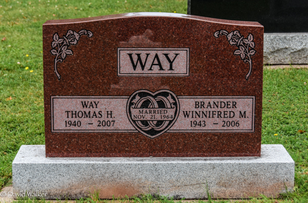 | Burial | He was buried in the Peoples Cemetery, Summerside, Prince County, Prince Edward Island, Canada, 46.40504, -63.77569G. Inscription: WAY / Way / Thomas H. / 1940 - 2007 | Married / Nov. 21, 1964 | BRANDER / Winnifred M. / 1943 - 2006.1 ![]() Tombstone, Thomas H. Way (1940-2007), his wife Winnifred M. Brander (1943-2006). Peoples Cemetery, Summerside, Prince County, Prince Edward Island, Canada. |
