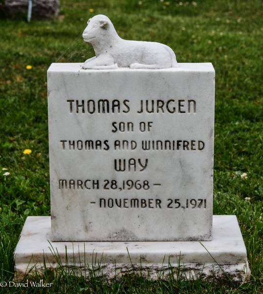 | Burial | He was buried in the Peoples Cemetery, Summerside, Prince County, Prince Edward Island, Canada, 46.40502, -63.77553G. Inscription: Thomas Jurgen / Son of / Thomas & Winnifred / Way / March 28, 1968 - November 25, 1971.1 ![]() Tombstone, Thomas Jurgen Way (1968-1971). Peoples Cemetery, Summerside, Prince County, Prince Edward Island, Canada. |