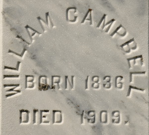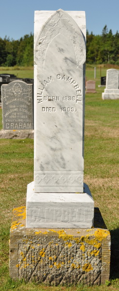 | Burial | He was buried in Geddie Memorial Cemetery, Springbrook, Queens County, Prince Edward Island, Canada, 46.49420, -63.50783G. stone #396. Inscription: William Campbell / Born 1836 / Died 1909 / CAMPBELL. Left: His son / Lorne / Born 1881 / Died 1911. / Robert Campbell / 1879 - 1946. Right: His daughter Jane W. / Born 1874 / Died 1904.1![]() Tombstone, William Campbell (1836-1909), his sons Lorne (1881-1911) and Robert (1879-1946) and daughter Jane Campbell (1874-1904). Geddie Memorial Cemetery, Springbrook, Queens County, Prince Edward Island, Canada. ![]() Front inscription detail. ![]() Left inscription detail. ![]() Right inscription detail. |