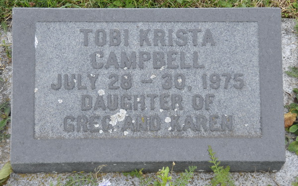 | Burial | She was buried in the Peoples Cemetery, Kensington, Prince County, Prince Edward Island, Canada, 46.44819, -63.62954G. Inscription: Tobi Krista / Campbell / July 28 - 30, 1975 / Daughter of / Greg & Karen.1![]() Tombstone, Tobi Krista Campbell (1975-1975). The Peoples Cemetery, Kensington, Prince County, Prince Edward Island. |