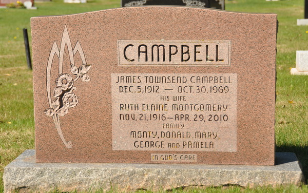 | Burial | He was buried in Geddie Memorial Cemetery, Springbrook, Queens County, Prince Edward Island, Canada, 46.49453, -63.50793G. stone #467. Inscription: CAMPBELL / James Townsend Campbell / Dec. 5, 1912 - Oct. 30, 1969 / His Wife / Ruth Elaine Montgomery / Nov. 21, 1916 - Apr. 29, 2010 / Family / Monty, Donald, Mary / George and Pamela / In God's Care.1 Tombstone, James Townsend Campbell (1912-1969), his wife Ruth Elaine Montgomery (1916-2010). Geddie Memorial Cemetery, Springbrook, Queens County, Prince Edward Island, Canada. |