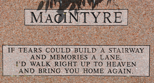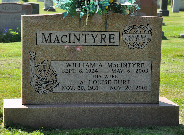 | Burial | She was buried in the Peoples Cemetery, Malpeque, Prince County, Prince Edward Island, Canada, 46.53056, -63.68648G. Inscription: MACINTYRE / Married / July 27, 1949 // William A. MacIntyre / Sept. 8, 1924 - May 6, 2003 / His Wife / A. Louise Burt / Nov. 20, 1931 - Nov. 20, 2001Back: MACINTYRE / If tears could build a stairway / And memories a lane, / I'd walk right up to Heaven / And bring you home again.2 Tombstone, William A. MacIntyre (1924-2003), his wife A. Louise Burt (1931-2001). Peoples Cemetery, Malpeque, Prince County, Prince Edward Island, Canada.  Back inscription detail. |