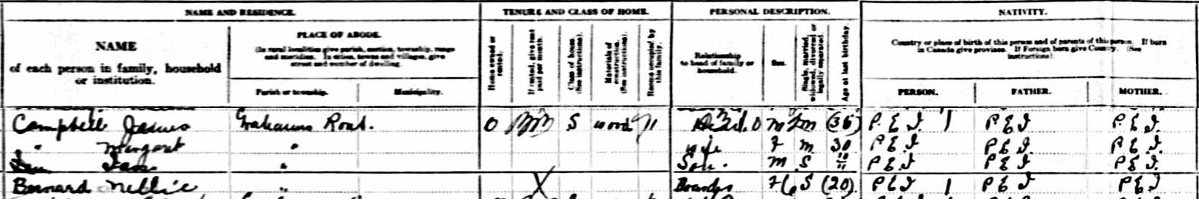 | Census | He was head of the household in the census on 1 June 1921 in Grahams Road, Queens County, Prince Edward Island, CanadaG. included in the household with James (age 35) were his wife Margaret MacEwen (age 30) and their son Ian (11 months). James was a farmer. The family religion was Presbyterian.4 1921 Canada Census, Grahams Road, Queens County, Prince Edward Island. Household of James Campbell, his wife Margaret MacEwen, their son Ian. |