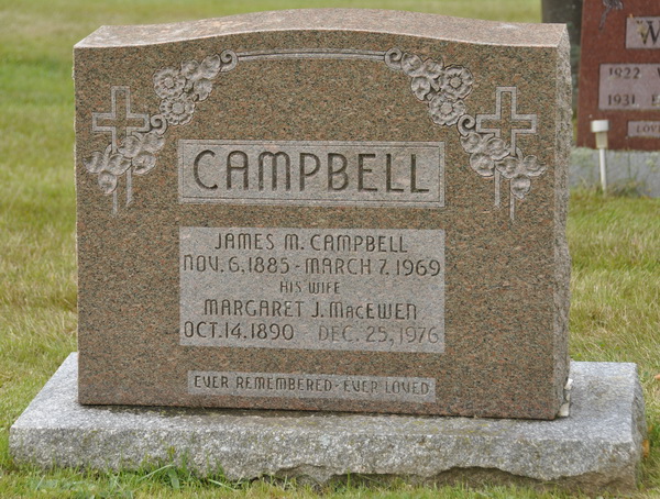 | Burial | He was buried in the Peoples Cemetery, New London, Queens County, Prince Edward Island, Canada, 46.46307, -63.51673G. Inscription: CAMPBELL / James M. Campbell / Nov. 6, 1885 - March 7, 1969 / His Wife / Margaret J. MacEwen / Oct. 14, 1890 - Dec. 25, 1976 / Ever Remembered, Ever Loved. Back: CAMPBELL.1 Tombstone, James M. Campbell (1885-1969), his wife Margaret J. MacEwen (1890-1976). Peoples Cemetery, New London, Queens County, Prince Edward Island, Canada. |