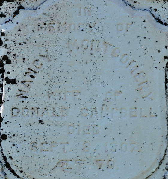 | Burial | She was buried in Geddie Memorial Cemetery, Springbrook, Queens County, Prince Edward Island, Canada, 46.49432, -63.50717G. stone #320. Inscription: In / memory of / Nancy Montgomery / Wife of / Donald Campbell / Died / Sept. 8, 1907, / AET. 70. / She was a kind and affectionate wife / A fond mother and friend to all.1 Tombstone, Nancy Montgomery (1837-1907). Geddie Memorial Cemetery, Springbrook, Queens County, Prince Edward Island, Canada.  Front inscription detail. |