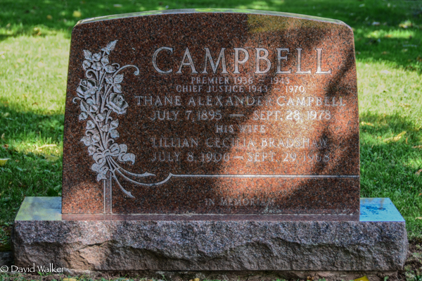 Inscription: CAMPBELL / Premier 1936 - 1943 / Chief Justice 1943 - 1970 / Thane Alexander Campbell / July 7, 1895 - Sept. 28, 1978 / His Wife / Lillian Cecilia Bradshaw / July 8, 1906 - Sept. 29, 1968 / In MemoriamBack: CAMPBELL / James Melville Campbell / Dec. 18, 1934 - Oct. 24, 1992 / His Wife / Mary Penelope MacGougan / Nov. 5, 1935 - Aug. 31, 2018.2  Cemetery marker, Thane Alexander Campbell (1895-1978), his wife Lillian Cecilia Bradshaw (1906-1968), their son James Melville Campbell (1934-1992), his wife Mary Penelope MacGougan (1935-2018). Peoples Cemetery, Summerside, Prince County, Prince Edward Island, Canada.  Back inscription detail.