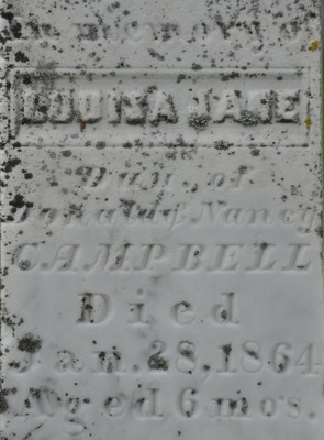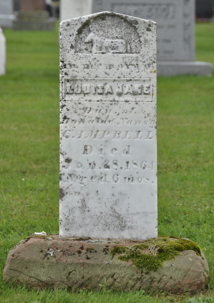 | Burial | She was buried in Geddie Memorial Cemetery, Springbrook, Queens County, Prince Edward Island, Canada, 46.49435, -63.50723G. Inscription: In memory of / Louisa Jane / Dau. of Donald & Nancy / Campbell / Died / Jan. 28, 1864, / Aged 6 mos.2 Tombstone, Louisa Jane Campbell (1863-1864). Geddie Memorial Cemetery, Springbrook, Queens County, Prince Edward Island.  Inscription detail. |