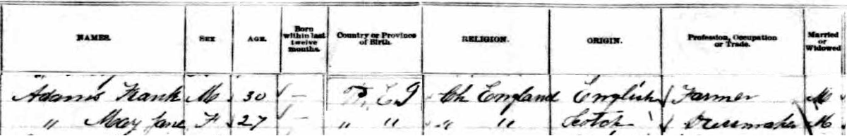 | Census | Francis Adams was head of the household in the census in 1881 in Lot 20, Queens County, Prince Edward Island, CanadaG. included in the household with Frank/Francis (age 30) was his wife Mary Jane Cousins (age 27). Frank was a fisherman. Sarah Jane was a dress maker. They were Anglican.1 1881 Canada Census, Lot 20, Queens County, Prince Edward Island. Household of Frank/Francis Adams, his wife Mary Jane Cousins. Census image courtesy of Library & Archives Canada. |