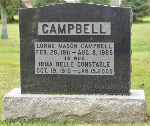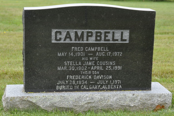 Inscription: CAMPBELL / Fred Campbell / May 14, 1901 - Aug. 17, 1972 / His Wife / Stella Jane Cousins / Mar. 30, 1902 - April 25, 1991 / Their Son / Frederick Davison / July 28, 1934 - July 1, 1971 / Buried in Calgary, Alberta. Back: CAMPBELL.2  Tombstone, Fred Campbell (1901-1972), his wife Stella Jane Cousins (1902-1991). Peoples Cemetery, New London, Queens County, Prince Edward Island, Canada.