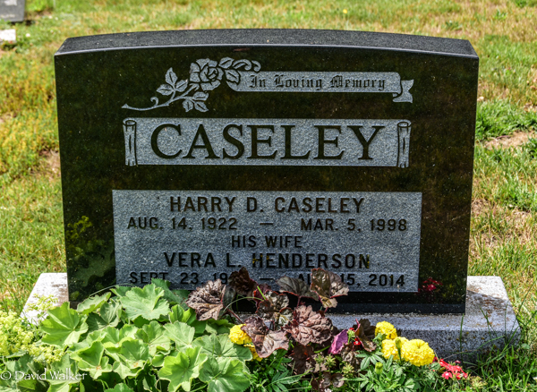 Inscription: In Loving Memory / CASELEY / Harry D. Caseley / Aug. 14, 1922 - Mar. 5, 1998 / His Wife / Vera L. Henderson / Sept. 23, 1923 - Aug. 15, 2014.1  Tombstone, Harry David Caseley (1922-1998), his wife Vera L. Henderson (1923-2014). United Church Cemetery, Margate, Prince County, Prince Edward Island, Canada.