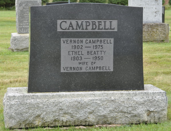 | Burial | She was buried in the Peoples Cemetery, New London, Queens County, Prince Edward Island, Canada, 46.46279, -63.51648G. Inscription: CAMPBELL / 1902 - 1975 / Ethel Beatty / 1903 - 1950 / Wife of / Vernon Campbell.1 Tombstone, Vernon Campbell, his wife Ethel Beatty. Peoples Cemetery, New London, Queens County, Prince Edward Island, Canada. |