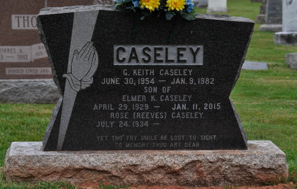 Inscription: CASELEY / W. Keith Caseley / June 30, 1954 - Jan. 9, 1982 / Son of / Elmer K. Caseley / April 29, 1929 - Jan. 11, 2015 / Rose (Reeves) Caseley / July 24, 1934 - / Yet tho' thy smile be lost to sight / To memory thou art dear.1,2  Tombstone, G. Keith Caseley (1954-1982), his father Elmer K. Caseley (1929-2015). Peoples Cemetery, Malpeque, Prince County, Prince Edward Island, Canada.