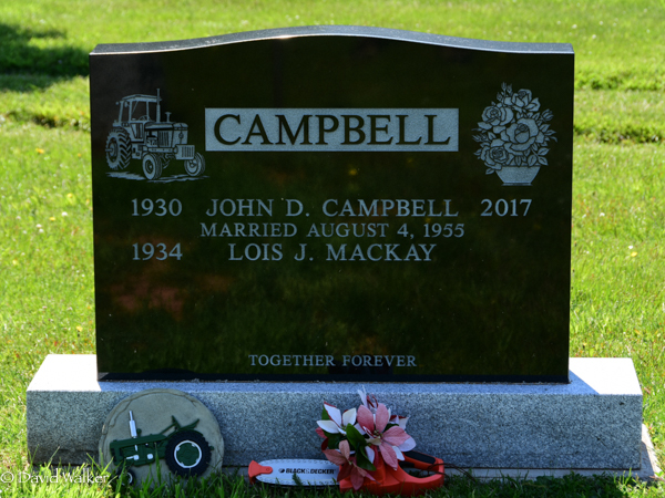 Inscription: CAMPBELL / 1930 John D. Campbell 2017 / Married August 4, 1955 / 1934 Lois J. MacKay / Together Forever.1,2  Tombstone, John D. Campbell (1930-2017), his wife Lois MacKay (1934- ). Peoples Cemetery, New London, Queens County, Prince Edward Island, Canada.