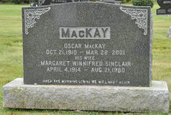 | Burial | She was buried in the Peoples Cemetery, New London, Queens County, Prince Edward Island, Canada, 46.46272, -63.51641G. Inscription: MACKAY / Oscar MacKay / Oct. 21, 1910 - Mar. 28, 2001 / His Wife / Margaret Winnifred Sinclair / April 4, 1914 - Aug. 21, 1980 / When the morning dawns we will meet again. Back: MACKAY.1 Tombstone, Oscar MacKay, his wife Winnifred Sinclair. Peoples Cemetery, New London, Queens County, Prince Edward Island, Canada. |