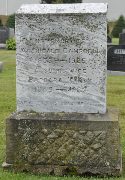 | Burial | She was buried in the Peoples Cemetery, New London, Queens County, Prince Edward Island, Canada, 46.46285, -63.51626G. Inscription: CAMPBELL / Archibald Campbell / 1853 - 1925 / Also His Wife / Barbara McKay / 1849 - 1933.1 Tombstone, Archibald Campbell (1853-1925), his wife Barbara MacKay (1849-1933). Peoples Cemetery, New London, Queens County, Prince Edward Island, Canada. |