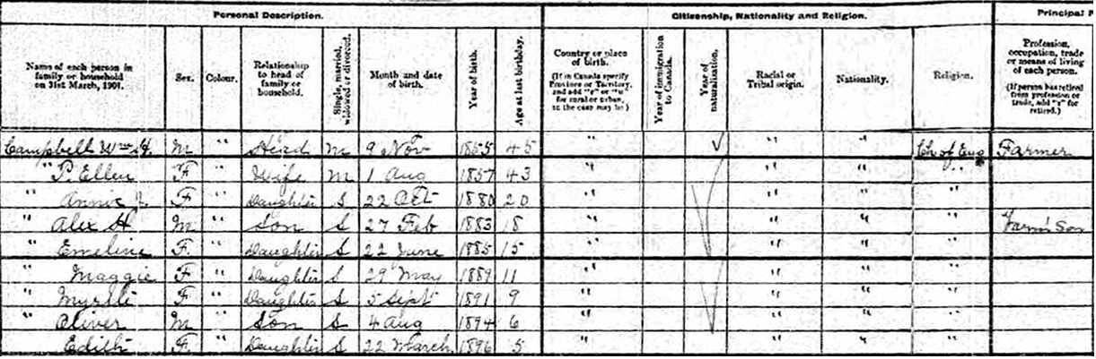 | Witness | She was enumerated on the census in 1901 in the household of William Hall Campbell in Lot 20, Queens County, Prince Edward Island, CanadaG. included in the household with William (age 45) were his wife Ellen (age 43), children Annie (age 20), Alex (age 18), Emeline (age 15), Maggie (age 11), Myrtle (age 9), Oliver (age 6) and Edith (age 5). William was a farmer, Alex a farmer's son. The family religion was Church of England.2 1901 Canada Census, Park Corner, Queens County, Prince Edward Island. Household of William Hall Campbell, his wife Priscilla Ellen Cousins, their children Annie, Alex, Emeline, Margaret, Myrtle, Oliver and Edith. |