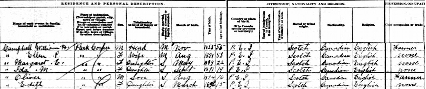 | Witness | She was enumerated on the census on 23 June 1911 in the household of William Hall Campbell in Lot 20, Park Corner, Queens County, Prince Edward Island, CanadaG. included in the household with William (age 55) were his wife Ellen (Cousins, age 53), and their children Margaret (age 22), Ida (age 19), Oliver (age 16) and Edith (age 15). William and Oliver were farmers.2 1911 Canada Census, Park Corner, Queens County, Prince Edward Island. Household of William Hall Campbell, his wife Priscilla Ellen Cousins, their children Margaret, Ida, Oliver and Edith. |