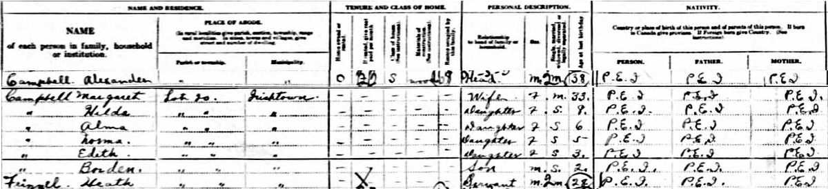 | Witness | She was enumerated on the census in 1921 in the household of Alexander Havelock Campbell in Irishtown, Queens County, Prince Edward Island, CanadaG. included in the household with Alex (age 38) were his wife Margaret (age 33), their children Hilda (Age 9), Alma (age 6), Norma (age 5), Edith (age 3) and Borden (age 2). Also in the household was Heath Frizzel (age 28) a servant). Alex was a farmer. The family religion was Anglican.3 1921 Canada Census, Irishtown, Lot 20, Queens County, Prince Edward Island. Household of Alexander Campbell, his wife Margaret Millman, their children Hilda, Alma, Norma, Edith & Borden, and an unrelated servant. |