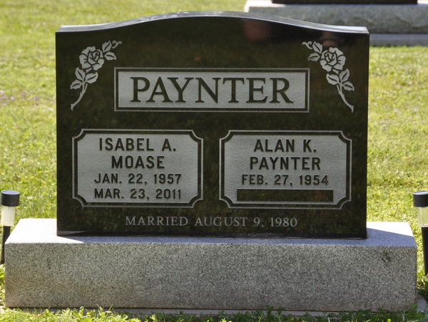 Inscription: PAYNTER / Isabel A. / Moase / Jan. 22, 1957 / Mar. 23, 2011 | Alan K. Paynter / Feb. 27, 1954 /.1,3  Tombstone, Isabel A. Moase (1957-2011), Alan K. Paynter (1954- ). Peoples Cemetery, Kensington, Prince County, Prince Edward Island, Canada. |