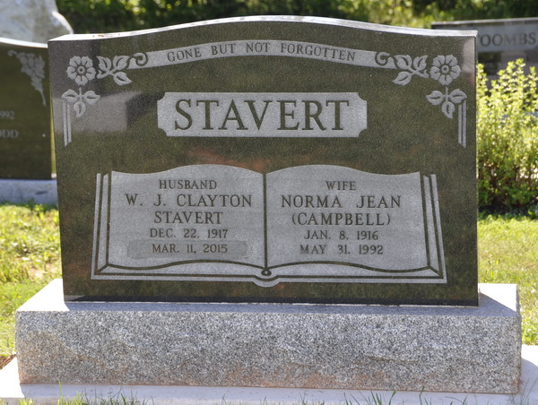 Inscription: Gone But Not Forgotten / STAVERT / Husband / W. J. Clayton / Stavert / Dec. 22, 1917 - Mar. 11, 2015 | Wife / Norma Jean / (Campbell) / Jan. 8, 1916 / May 31, 1992.2  Tombstone, W. J. Clayton Stavert (1917-2015), his wife Norma Jean Campbell (1916-1992). Peoples Cemetery, Kensington, Prince County, Prince Edward Island, Canada.