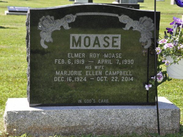 Inscription: MOASE / Elmer Roy Moase / Feb. 6, 1919 - April 7, 1990 / His Wife / Marjorie Ellen Campbell / Dec. 16, 1924 - Oct. 22, 2014 / In God's Care.4,1  Tombstone, Elmer Roy Moase (1919-1990), his wife Marjorie Ellen Campbell (1924-2014). Peoples Cemetery, Kensington, Prince County, Prince Edward Island, Canada.