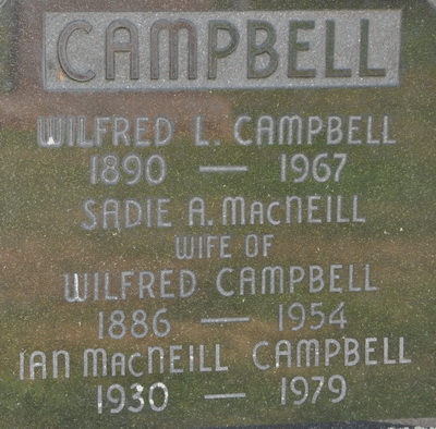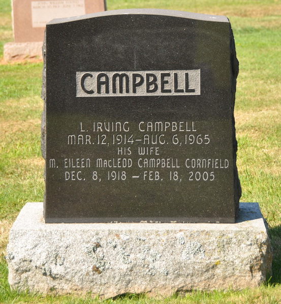 | Burial | He was buried in Geddie Memorial Cemetery, Springbrook, Queens County, Prince Edward Island, Canada, 46.49407, -63.50818G. Inscription: CAMPBELL / L. Irving Campbell / Mar. 12, 1914 - Aug. 6, 1965 / His Wife / M. Eileen MacLeod Campbell Cornfield / Dec. 8, 1918 - Feb 18, 2005. Back: CAMPBELL / Wilfred L. Campbell / 1890 - 1967 / Sadie A, MacNeill / Wife of / Wilfred Campbell / 1886 - 1954 / Ian MacNeill Campbell / 1930 - 1979.2 Tombstone, L. Irving Campbell (1914-1965), his wife Eileen MacLeod (1918-2005), Irving's father Wilfred Campbell (1890-1967), mother Sadie MacNeill (1886-1954) and brother Ian MacNeill Campbell (1930-1979). Geddie Memorial Cemetery, Springbrook, Queens County, Prince Edward Island, Canada.  Back inscription detail. |