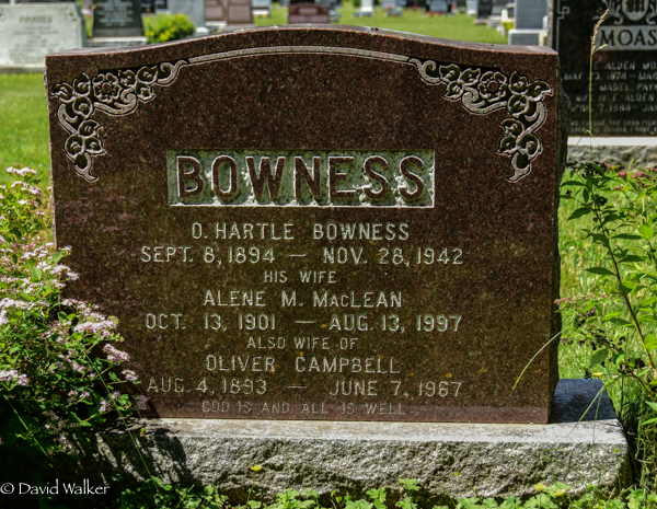 Inscription: BOWNESS / O. Hartle Bowness / Sept. 8, 1894 - Nov. 28, 1942 / His Wife / Alene M. MacLean / Oct. 13, 1901 - Aug. 13, 1997 / Also wife of / Oliver Campbell / Aug. 4, 1893 - June 7, 1967Flatstones: Hartle | Oliver.4  Tombstone, Oliver Hartle Bowness (1894-1942), his wife Alene M. MacLean (1901-1997), Alene's second husband Oliver Campbell (1893-1967). Peoples Cemetery, Summerside, Prince County, Prince Edward Island, Canada.