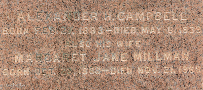 Inscription: William H. Campbell / Born Nov. 9, 1855 - Died Mar. 5, 1919 / Also His Wife / Priscilla Ellen Cousins / Born Aug. 1, 1857 - Died Sept. 30, 1948 / His Daughter / Ida Myrtle / 1891 - 1933 / CAMPBELLLeft: His Grand Child / Ella Ruth / Williams / Died / Aug. 18, 1906 / Aged 4 months / Asleep in JesusRight: His Grand Child / Edith Muriel / 1917 - 1933 / Back: Alexander H. Campbell / Born Feb. 27, 1883 - Died May 6, 1939. / Also His Wife / Margaret Jane Millman /Born Oct. 22, 1868 - Died Nov. 21, 1965 / CAMPBELL.1  Tombstone, William Hall Campbell (1855-1919), his wife Priscilla Ellen Campbell (1857-1948), their daughter Ida Myrtle Campbell (1891-1933), their granddaughter Ella Ruth Williams (1906-1906) [daughter of Annie J. Campbell & Will Williams], their son Alexander H. Campbell (1883-1939), his wife Margaret Jane Millman (1868-1961), their daughter Edith Muriel Campbell (1917-1933). St. Stephen's Anglican Cemetery, Irishtown, Queens County, Prince Edward Island, Canada.  Front inscription detail.  Left inscription detail.  Right inscription detail.  Back inscription detail.