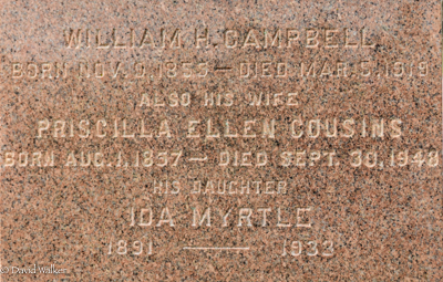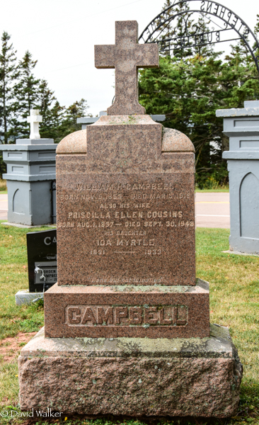 - [S11219] Cemetery Marker, St. Stephen's Anglican Cemetery, Burlington, Prince County, Prince Edward Island, Canada. William H. Campbell & Priscilla Ellen Cousins, inscription; read by David A. Walker, 2016.