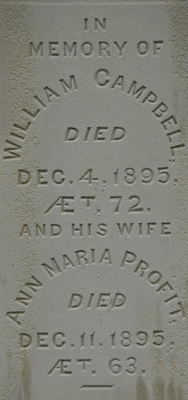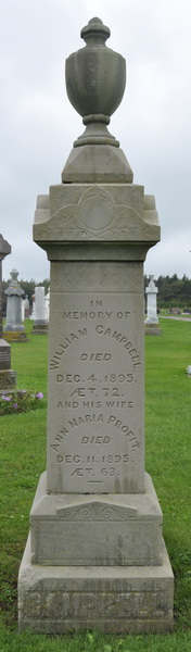 - [S8910] Tombstone, Geddie Memorial Cemetery, Springbrook, Queens County, Prince Edward Island, Canada. William Campbell & Ann Maria Profitt, marker inscription; read by David A. Walker, 12 September 2013.