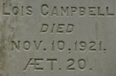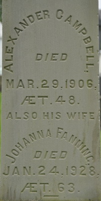 | Burial | She was buried in Geddie Memorial Cemetery, Springbrook, Queens County, Prince Edward Island, Canada, 46.49442, -63.50700G. Inscription: In / Memory of / William Campbell / Died / Dec. 4, 1895 / ÆT. 72. / Also His Wife / Ann Maria Profit / Died / Dec. 11, 1895 / ÆT. 63. / CAMPBELLLeft: Lois Campbell / Died / Nov. 10, 1921, / ÆT. 20Right: Alexander Campbell / Died / Mar. 29, 1906, / ÆT. 48 / Also His Wife / Johanna Fanning / Died / Jan. 24, 1928, / ÆT. 63.4 Tombstone, William Campbell (1823-1895), his wife Ann Maria Profitt (1832-1895), their granddaughter Lois Campbell (1901-1921), their son Alexander (1858-1906), his wife Johanna Fanning McLean(1865-1928). Geddie Memorial Cemetery, Springbrook, Queens County, Prince Edward Island.  Front inscription detail.  Left inscription detail.  Right inscription detail. |