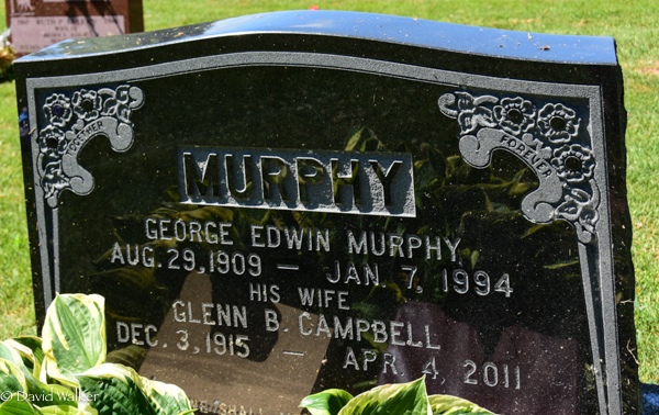 Inscription: MURPHY / George Edwin Murphy / Aug. 29, 1909 - Jan. 7, 1994 / His Wife / Glenn B. Campbell / Dec. 3, 1915 - Apr. 4, 2011.2,3  Tombstone, George Edwin Murphy (1909-1994), his wife Glenn B. Campbell (1915-2011). St. Stephen's Anglican Church Cemetery, Irishtown, Prince County, Prince Edward Island, Canada.