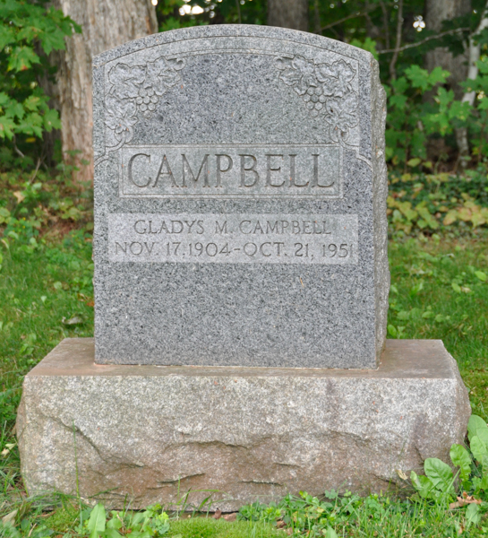 Inscription: CAMPBELL / Gladys M. Campbell / Nov. 17, 1904 - Oct. 21, 1951.5,2  Tombstone, Gladys M. Campbell (1904-1951). United Church Cemetery, Montrose, Prince County, Prince Edward Island.