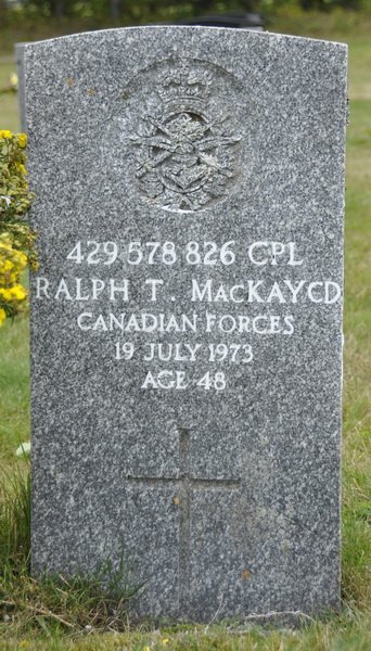 | Burial | He was buried in the Peoples Cemetery, Kensington, Prince County, Prince Edward Island, Canada, 46.44797, -63.62950G. Inscription: MACKAY / Russell E. MacKay / Aug. 26, 1893 - Apr. 18, 1975 / His Wife / Mamie E. Thompson / Jan. 9, 1896 - Feb. 15, 1974 / Their son, Cpl. Ralph T. / Sept. 18, 1924 - July 19, 1973 / His Wife Bernardine Morrissey / Jul 1, 1917 - Sept. 16, 2005 / God is our refuge and strengthMilitary Marker: 429 578 826 CPL / Ralph T. MacKay CD / Canadian Forces / 19 July 1973 / Age 48.1 Tombstone, Russell E. MacKay (1893-1975), his wife Mamie E. Thompson (1896-1974), their son Ralph T. MacKay (1924-1973), his wife Bernardine Morrissey (1917-2005). The Peoples Cemetery, Kensington, Prince County, Prince Edward Island.  Military marker, Cpl. Ralph T. MacKay. |