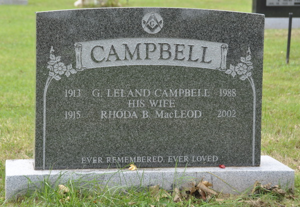 | Burial | She was buried in Geddie Memorial Cemetery, Springbrook, Queens County, Prince Edward Island, Canada, 46.49444, -63.50809G. Inscription: CAMPBELL / 1913 G. Leland Campbell 1988 / His Wife / 1915 Rhoda B. MacLeod 2002.2 Tombstone, Gordon Leland Campbell (1913-1988), his wife Rhoda B. MacLeod (1915-2002). Geddie Memorial Cemetery, Springbrook, Queens County, Prince Edward Island. |