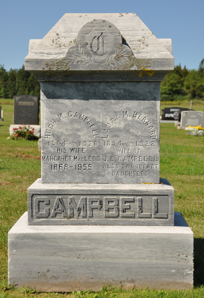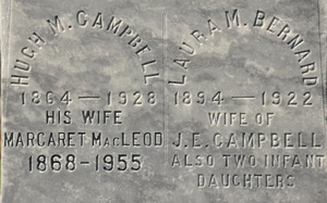 Inscription: Hugh M. Campbell / 1864 - 1928 / His Wife / Margaret MacLeod / 1868 - 1955 | Laura M. Bernard /1894 - 1922 / Wife of / J. E. Campbell / Also two infant daughters. // CAMPBELL Right: John E. Campbell / 1889- 1972.1  Tombstone, Hugh M. Campbell (1864-1928), his wife Margaret MacLeod (1868-1955), Laura Bernard (1894-1922), first wife of their son John Edwin Campbell, and their son John Edwin Campbell (1889-1972). Geddie Memorial Cemetery, Springbrook, Queens County, Prince Edward Island, Canada.  Front inscription detail.  Back inscription detail.