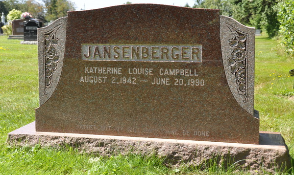 | Burial | She was buried in the Peoples Cemetery, Malpeque, Prince County, Prince Edward Island, Canada, 46.53064, -63.68646G. Inscription: JANSENBERGER / Katherine Louise Campbell / August 2, 1942 - June 20, 1990 / Father, not my will, but thine be done.1 Tombstone, Katherine Louise Campbell (1942-1990). Peoples Cemetery, Malpeque, Prince County, Prince Edward Island, Canada. |