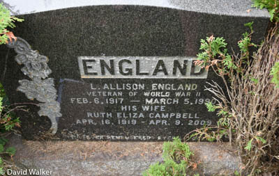 Inscription: ENGLAND / L. Allison England / Veteran of World War II / Feb. 6, 1917 - March 5, 1990 / His Wife / Ruth Eliza Campbell / Apr. 16, 1919 - Apr. 9, 2009Back: ENGLAND.1,2  Tombstone, L. Allison England (1917-1990), his wife Ruth Eliza Campbell (1919-2009). St. John's Anglican Church Cemetery, Ellerslie, Prince County, Prince Edward Island, Canada.