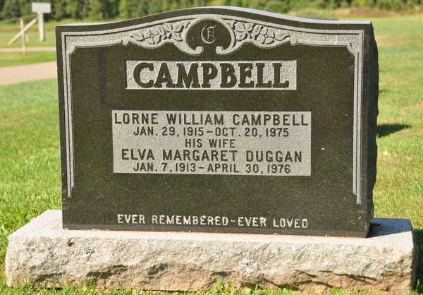 | Burial | He was buried in Geddie Memorial Cemetery, Springbrook, Queens County, Prince Edward Island, Canada, 46.49437, -63.50804G. stone #469. Inscription: CAMPBELL / Lorne William Campbell / Jan. 29, 1915 - Oct. 20, 1975 / His Wife / Elva Margaret Duggan / Jan. 7, 1913 - April 30, 1976 / Ever remember, ever loved.1 Tombstone, Lorne William Campbell (1915-1975), his wife Elva Margaret Duggan (1913-1976). Geddie Memorial Cemetery, Springbrook, Queens County, Prince Edward Island, Canada. |