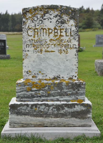 | Burial | He was buried in Geddie Memorial Cemetery, Springbrook, Queens County, Prince Edward Island, Canada, 46.49413, -63.50794G. Inscription: CAMPBELL / In Loving Memory of / Norwood Campbell / 1918 - 1952.2 Tombstone, Norwood Campbell (1918-1952). Geddie Memorial Cemetery, Springbrook, Queens County, Prince Edward Island. |